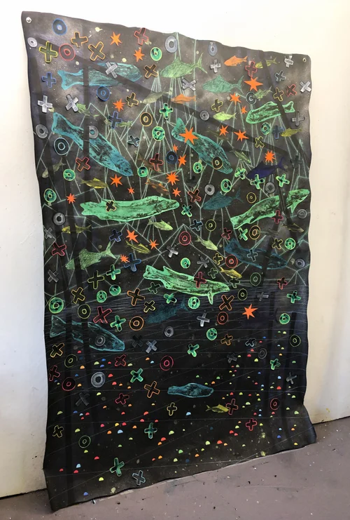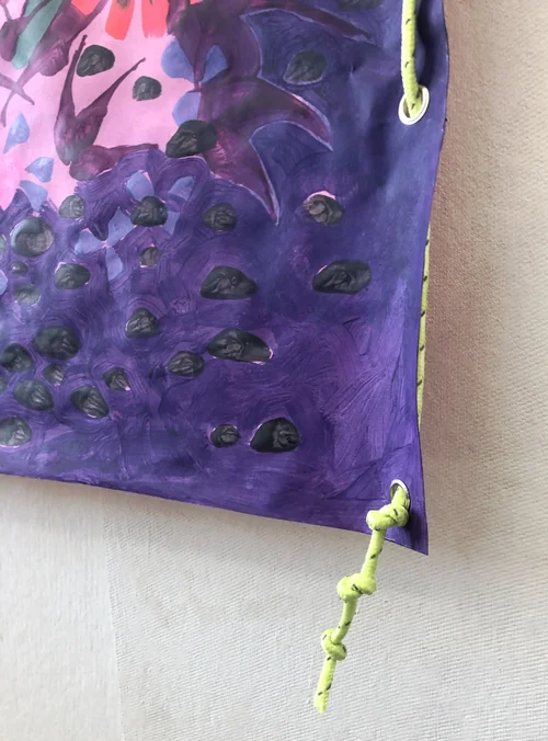 Acrylic paint on paper, rope, grommets and nails.
