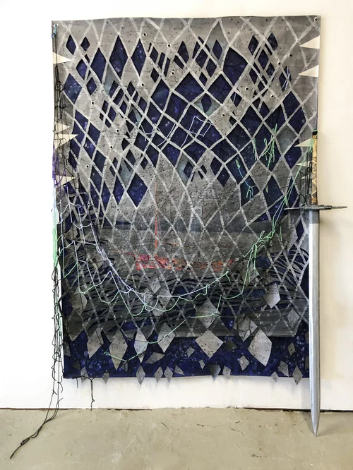 Acrylic paint and colored pencil on paper, painted paper collage, grommets, nails, rope and foam pool noodle.